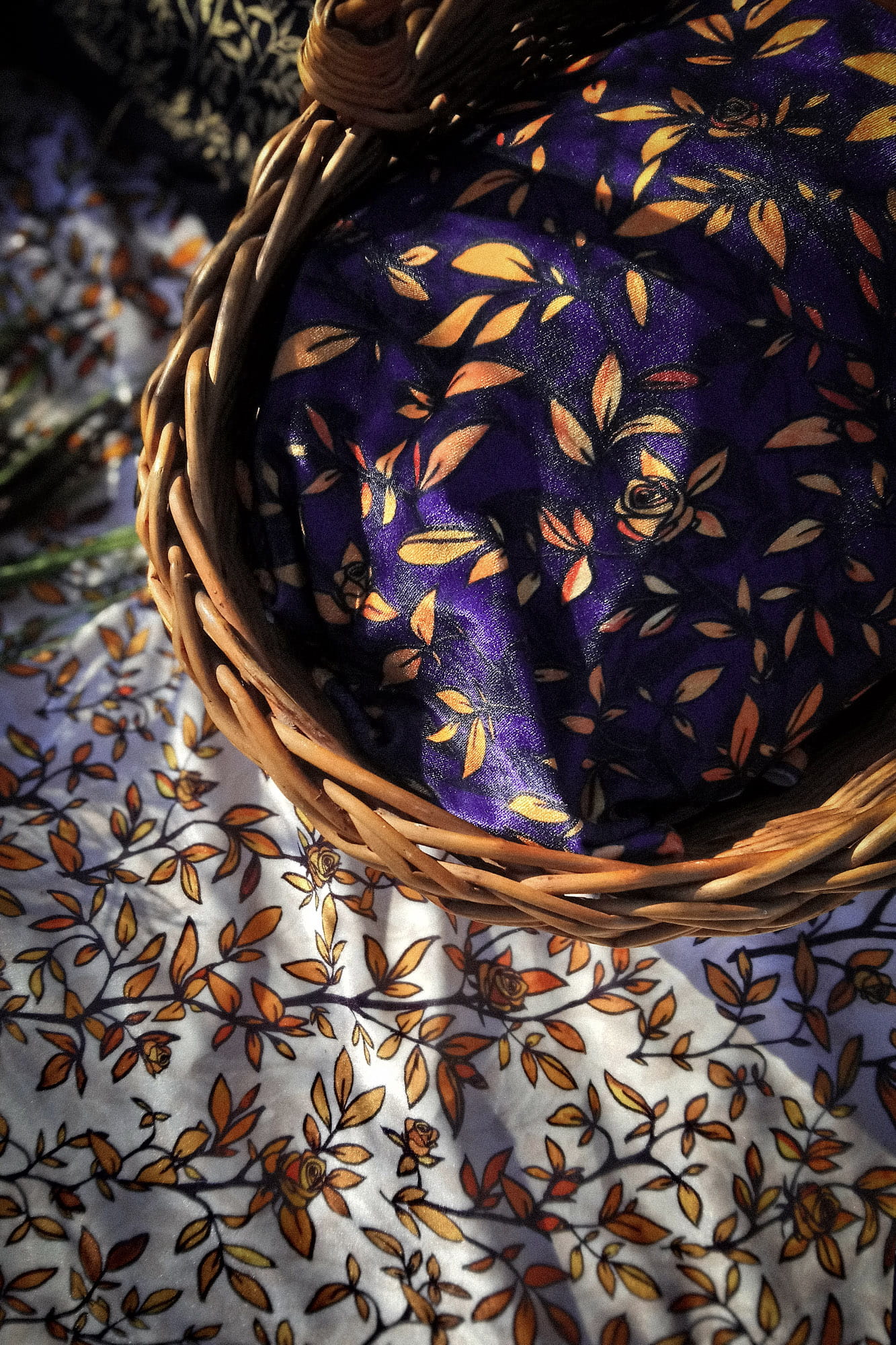 kolorystyka wzoru róże: jasne tło (ecru) z intensywnie żółto-pomarańczowymi różami i czarnymi konturami.