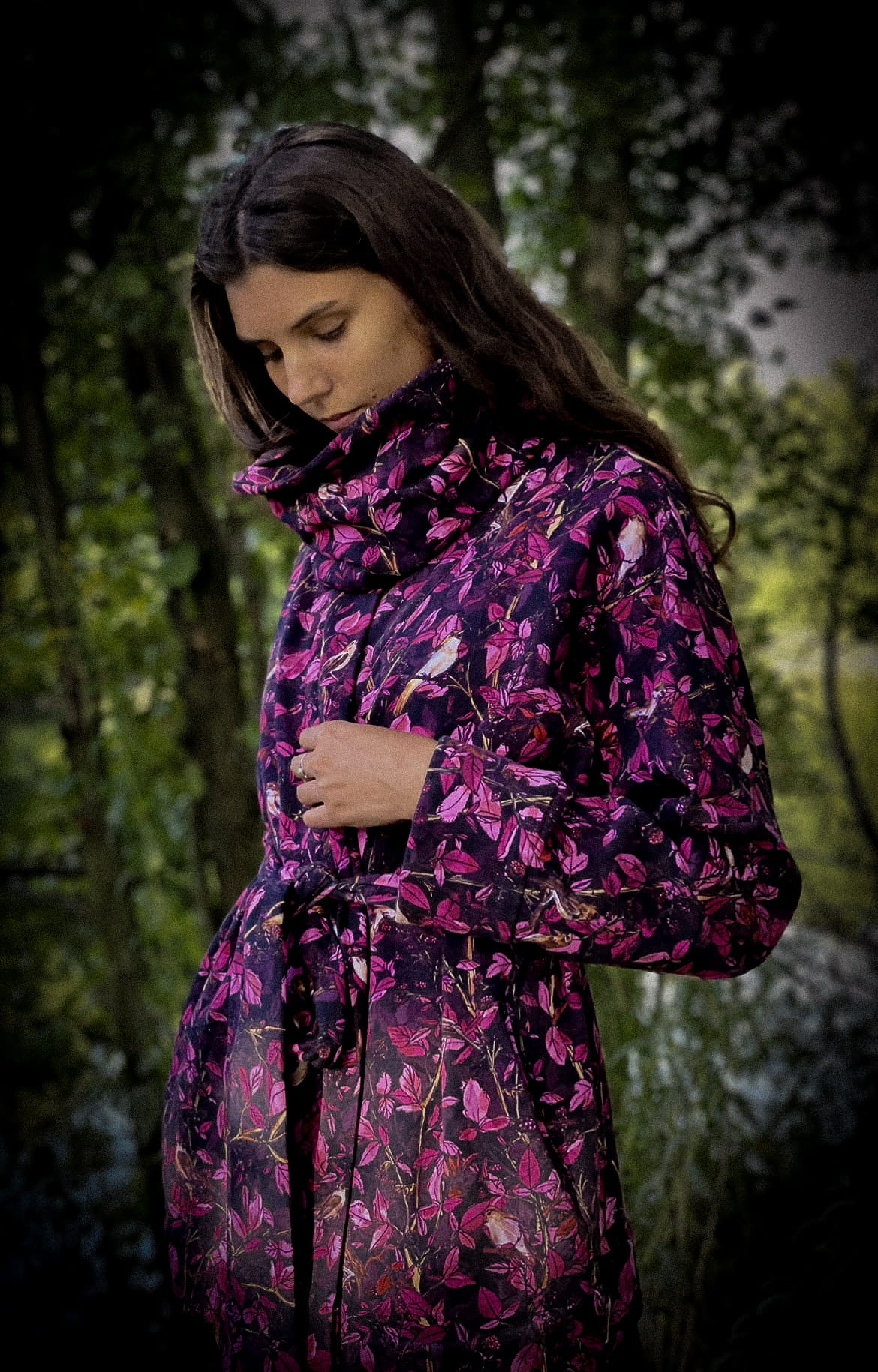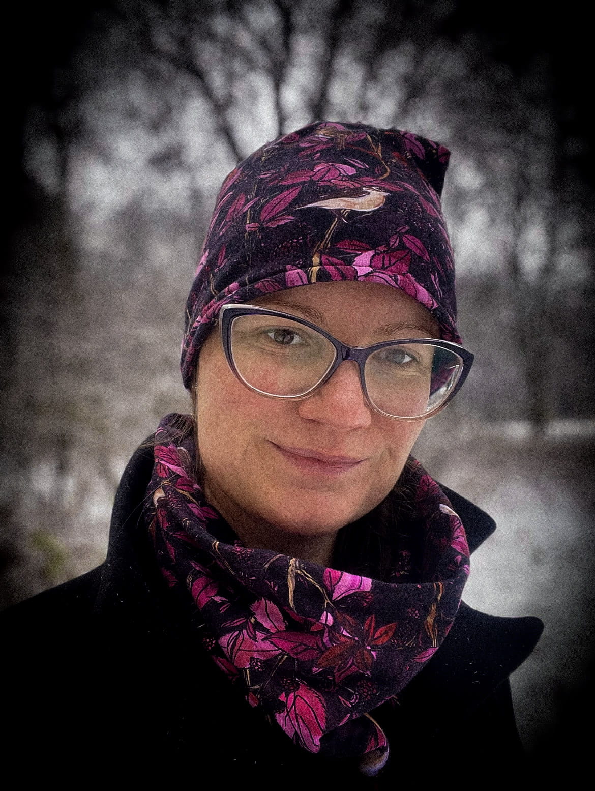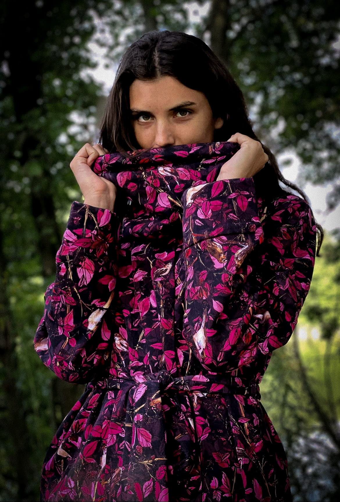 KOMIN (dopasowany i ciepły) autorski print różowe MALINY i jeżyny ze słowikami (bawełna) (Rozmiar: uniwersalny; chcesz w zestawie?: tylko komin)