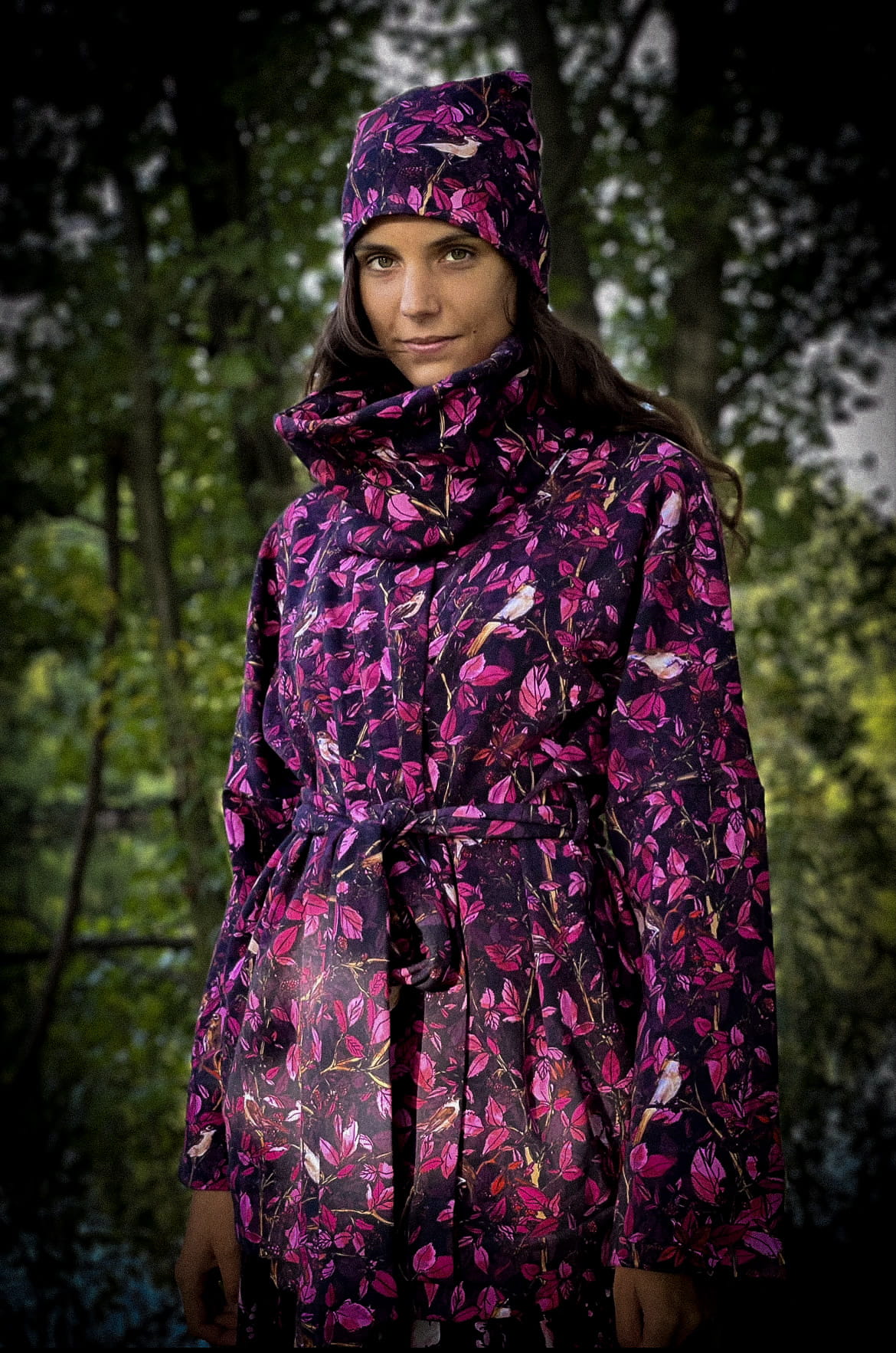 Taniej w zestawie!Płaszcz w 2 rozmiarach (długość do połowy uda) uszyty z ciepłej dzianiny bawełnianej w BORDOWE MALINY, jest jak najlepsza bluza. Kopertowy krój kimona z długim rękawem dopasujesz do swojej figury/podkreślisz talię szerokim paskiem, który spokojnie zawiążesz na 2razy (ten w zestawie ma 2m długości!) Płaszczobluza ma kieszenie oraz idealnie pasujące kolorystycznie czapkę i komin. Możesz nosić rozpięty jako stylową narzutkę lub super ciepły domowy szlafrok na zimę, który możesz nosić na gołą skórę.